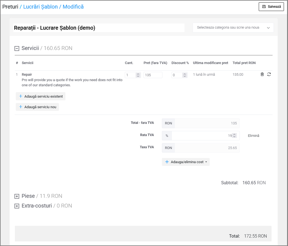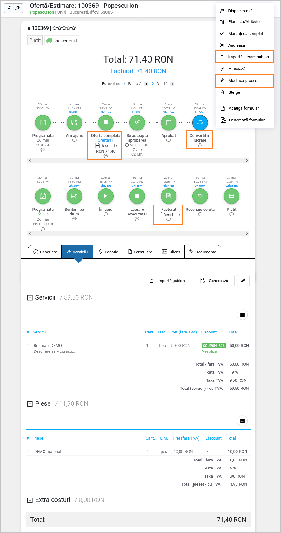 Câștigarea unei oportunități nu este niciodată ușoară. HomeService oferă lucrări șablon care sunt foarte versatile, permițându-vă să oferiți dicount % per linie, per secțiune (servicii/materiale) sau per lucrare.