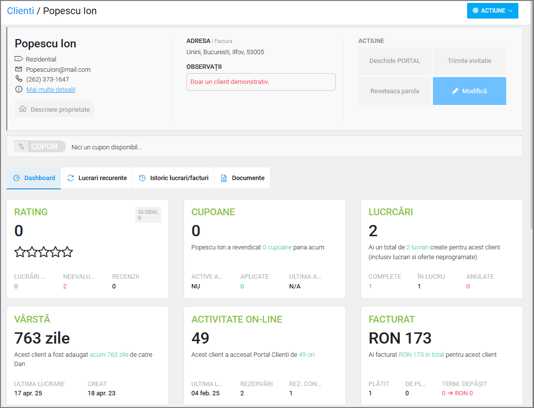 V-ar plăcea să aveți un istoric al comenzilor dvs. de servicii preferate? Credem că DA! Și credem că și clienților tăi le-ar plăcea! Puteți trimite invitații oricăruia dintre clienții dvs. pentru a avea acces la Portal Clienți, unde, printre altele, pot vedea tot istoricul lucrărilor lor.