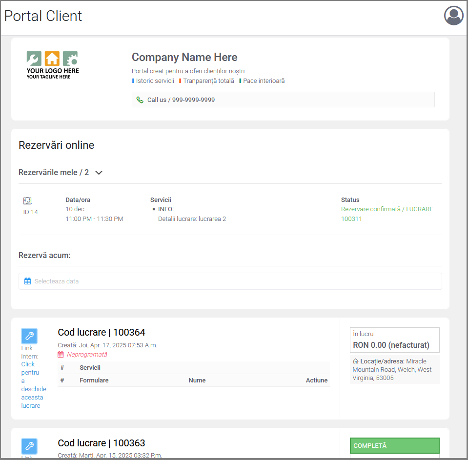 Ți-ar plăcea să rezervi online serviciul preferat cu doar câteva clicuri? Noi credem că da! Și credem că și clienților tăi le-ar plăcea! Aplicația HomeService vine cu un portal pentru clienți încorporat unde clienții dvs. își pot rezerva online serviciile. Veți vedea instantaneu rezervările făcute în calendarul dvs. și în pagina de lucru principală.