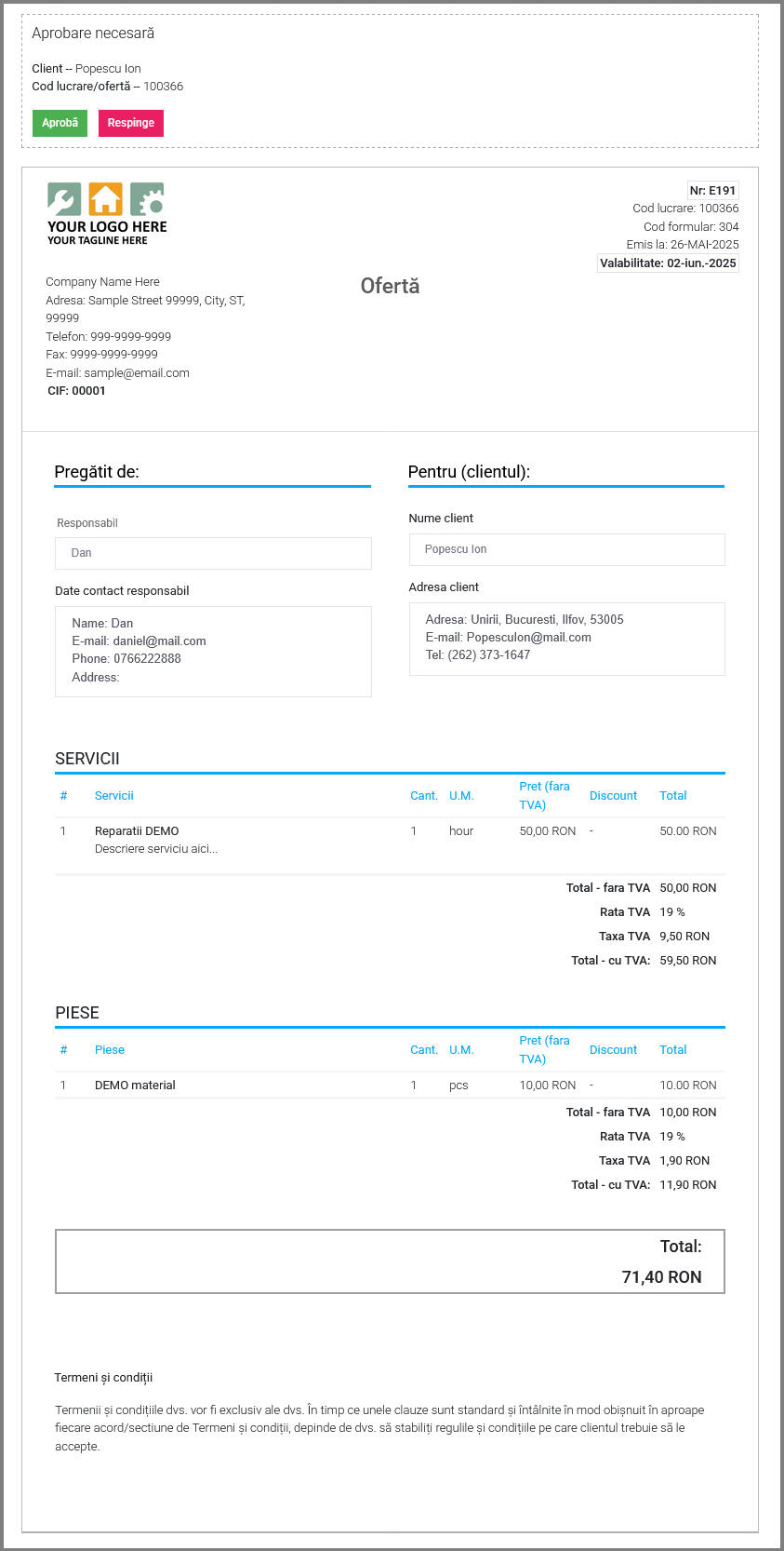 Ori de câte ori se creeză un deviz în sistem, îl poți partaja automat cu clientul pentru aprobare. Odată ce clientul acceptă oferta, poți transforma devizul într-o lucrare cu un singur clic.