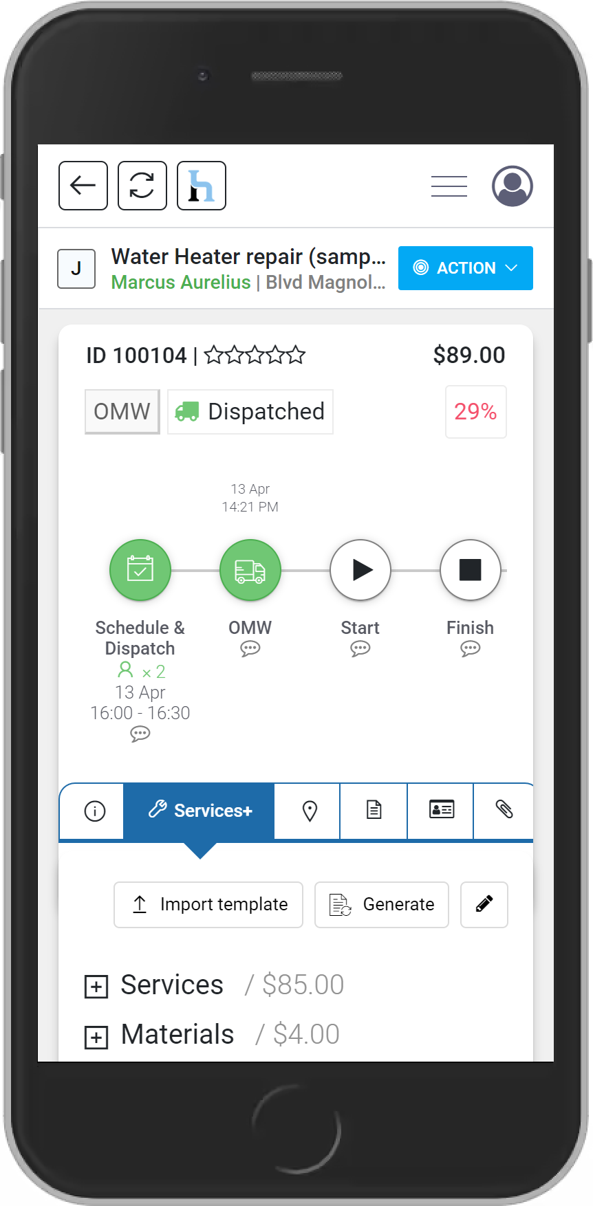 Simplificarea lucrurilor nu este chiar atât de simplă. Pentru a te ajuta în acest sens, orice lucrare sau deviz creat în HomeService este format din câțiva pași personalizabili de execuție (similari cu etapele unui proiect). Astfel, tu și angajații tăi nu va trebui să vă amintiți fiecare pas după ce creați o lucrare sau un deviz – totul este organizat clar, direct în fața voastră.
