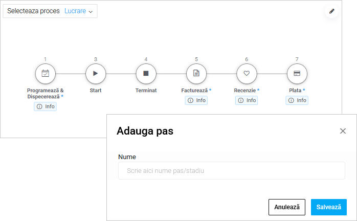 Nu trebuie să îți adaptezi afacerea la HomeService. Acest software a fost creat astfel încât să se adapteze modului tău de lucru. Editorul de pași execuție îți permite să adaugi sau să editezi orice etapă importantă în procesul de execuție a lucrărilor – de la programare și alocare, până la finalizare. De asemenea, poți folosi Editorul de etape pentru devize pentru a ajusta procesul de executie a devizelor conform nevoilor tale.