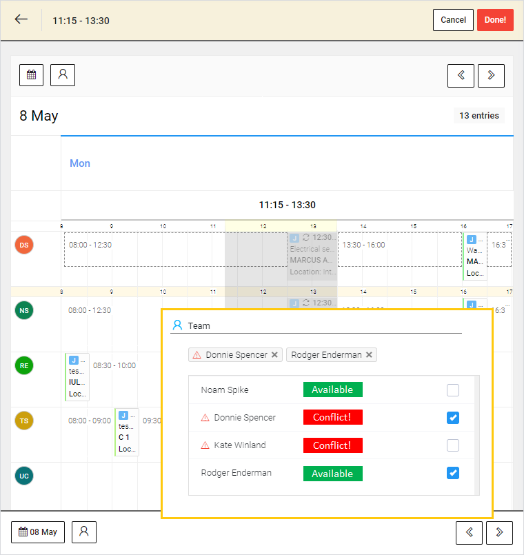 Atunci când aloci o lucrare sau un deviz, planificatorul îți afișează instant personalul disponibil. Nu mai trebuie să derulezi calendarul în toate direcțiile pentru a găsi persoane libere – acestea sunt listate automat în înregistrarea din calendar!